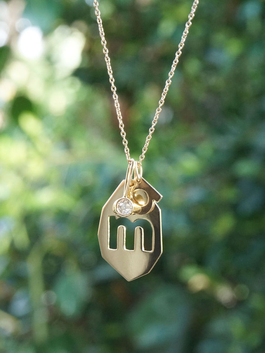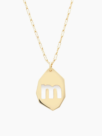 Each pendant is cut from gold melted and rolled flat in my studio. Every letter is meticulously etched, sawed and filed by hand in the shape of a modern sans serif font. No two letters are identical copies due to the hand fabricated nature of my work, but you can expect size and aesthetic consistency.