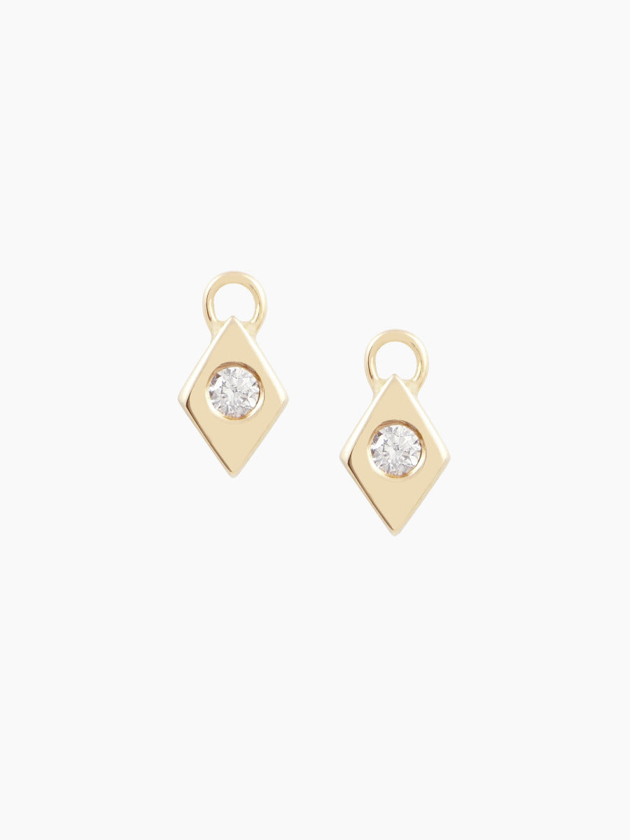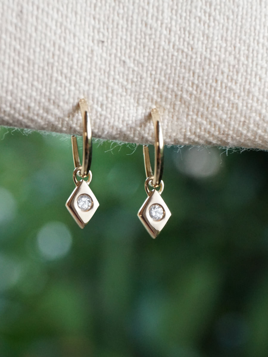 The 14k Geometric Diamond Charms are sleek, modern charms made for the 14k Huggie Hoops. This design features a diamond-shaped charm with a flush set natural, reclaimed diamond.